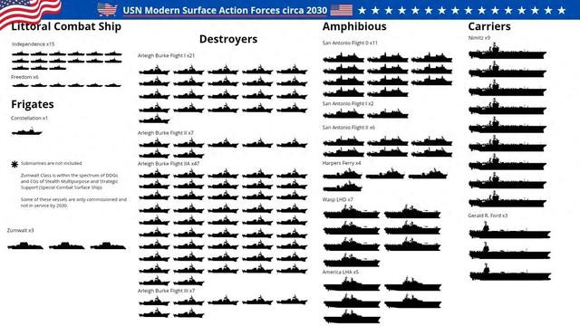 根据开源平台上出现的水面舰艇阵容图,到2030年的时候,美国海军能够拥有9艘“尼米兹”级和3艘“福特”级的12艘航母;同时拥有包括7艘“黄蜂”级、5艘“美国”级在内的35艘两栖舰艇;多个批次的“阿利·伯克”级驱逐舰加3艘“朱姆沃尔特”级,一共85艘驱逐舰;21艘濒海战斗舰以及1艘“星座”级护卫舰。